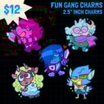 2.5 inch charms of Kris, Susie, Noelle and Ralsei! All of these are single-sided designs over solid black acrylic.